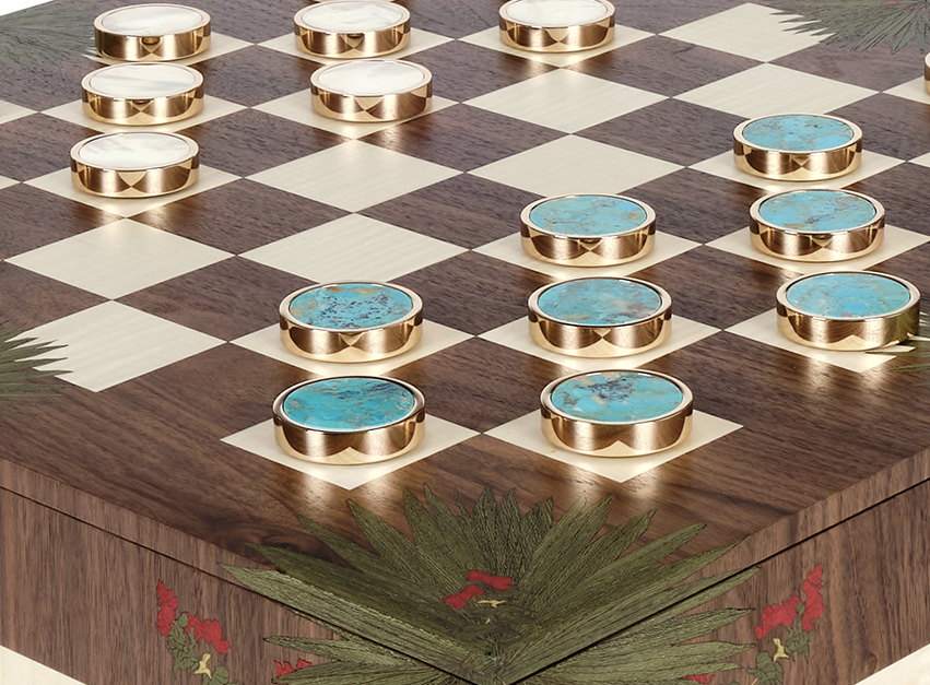 Designed to commemorate a specific place and time in the client’s life, her love of Moghul design and romantic memories of the Taj Mahal inspired this opulent wood marquetry backgammon board. Redolent with the colours, flowers and patterns of India, the inlaid tulip and carnation flowers emulate the marble inlay decorating the walls of the Taj Mahal.