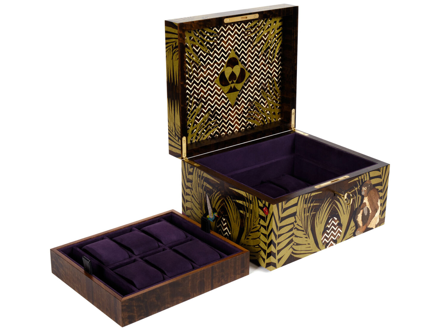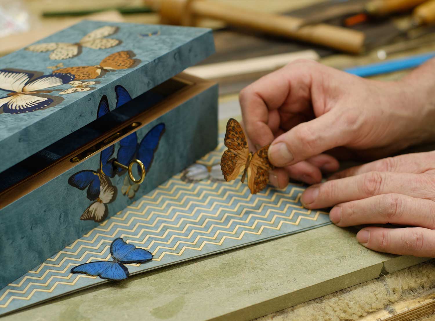 Each box captures the essence of the client’s story and is interpreted through intricate sustainable wood marquetry. The Butterfly jewellery box showcasing the stunning art of wood inlay, a vibrant jungle scene of the Watches Box or bringing the joy of play to vibrant life with our double playing cards box.