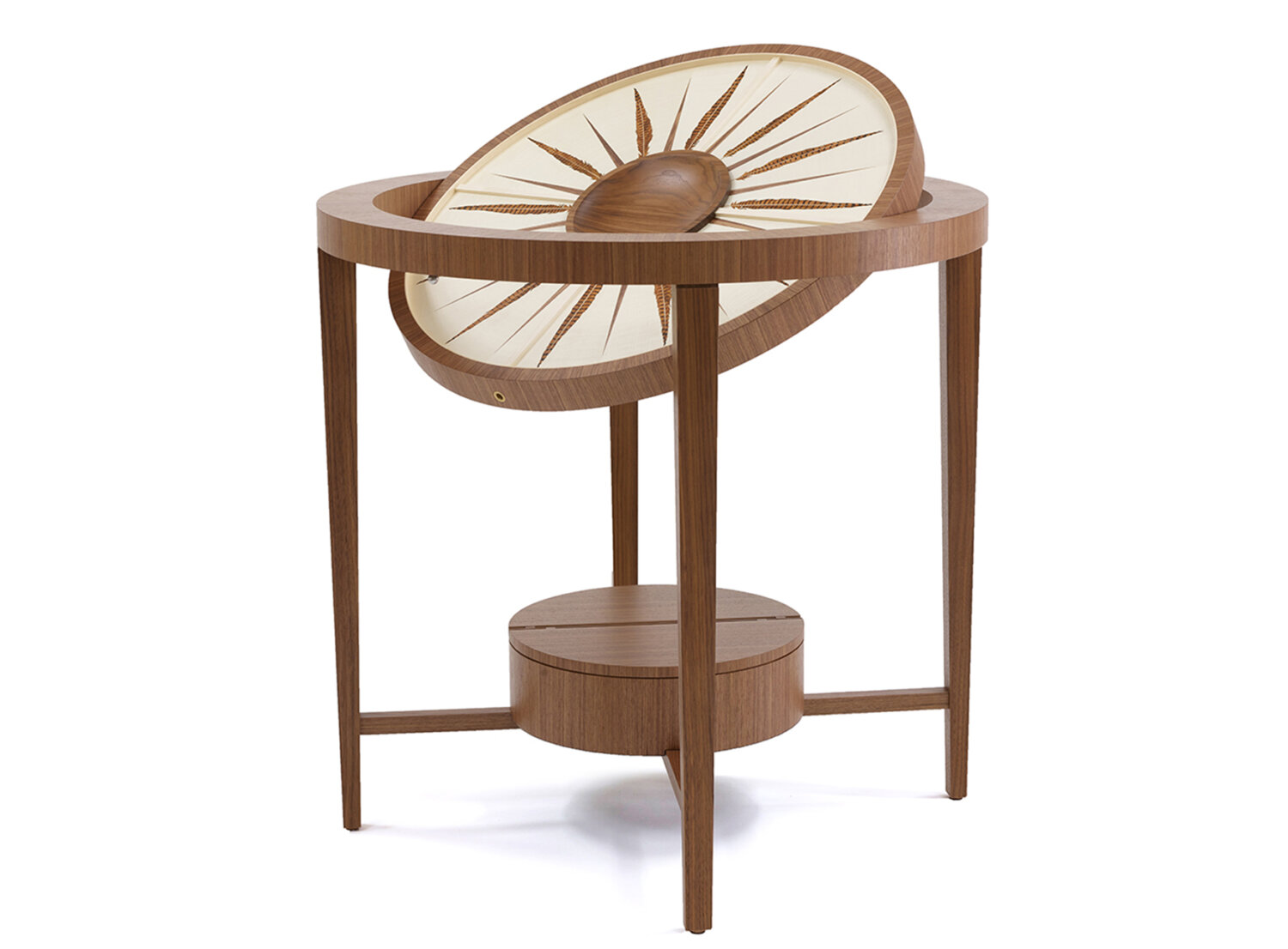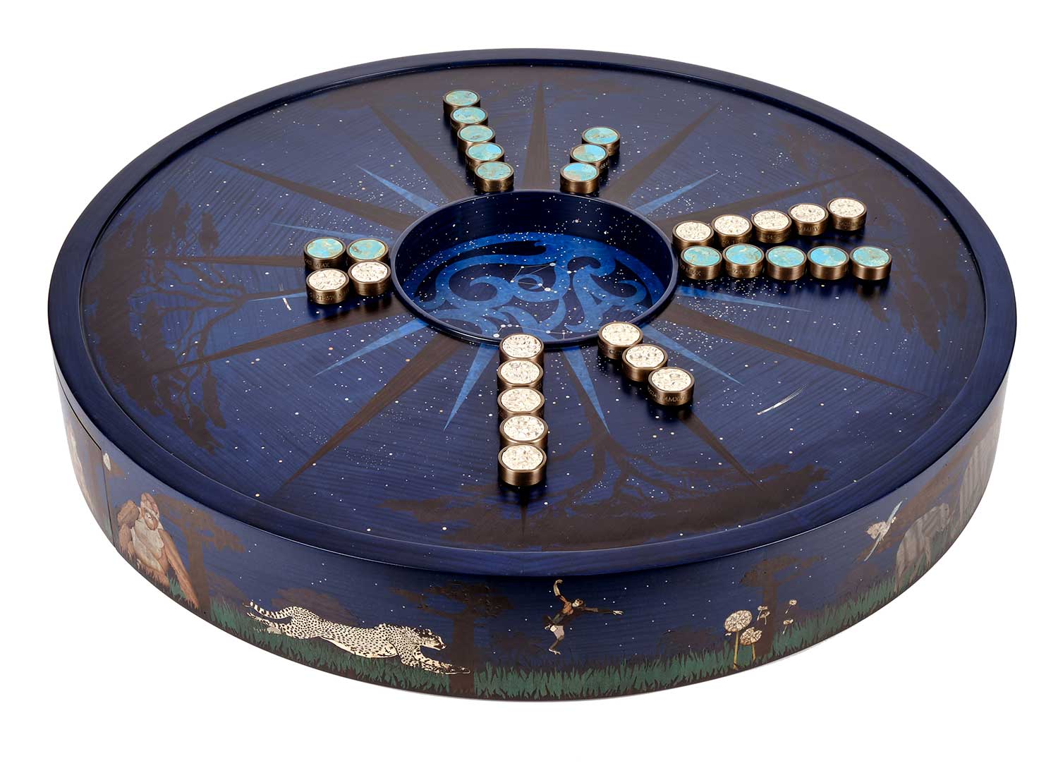 One of Alexandra’s all-time favourite private commissions, this bespoke circular marquetry backgammon set is a celebration of family, love and Africa. Inspired by gin and tonics enjoyed beneath the magnificent night sky, the design weaves in numerous personal references, including the client’s favourite African wildlife, inlaid around the edge of the board.