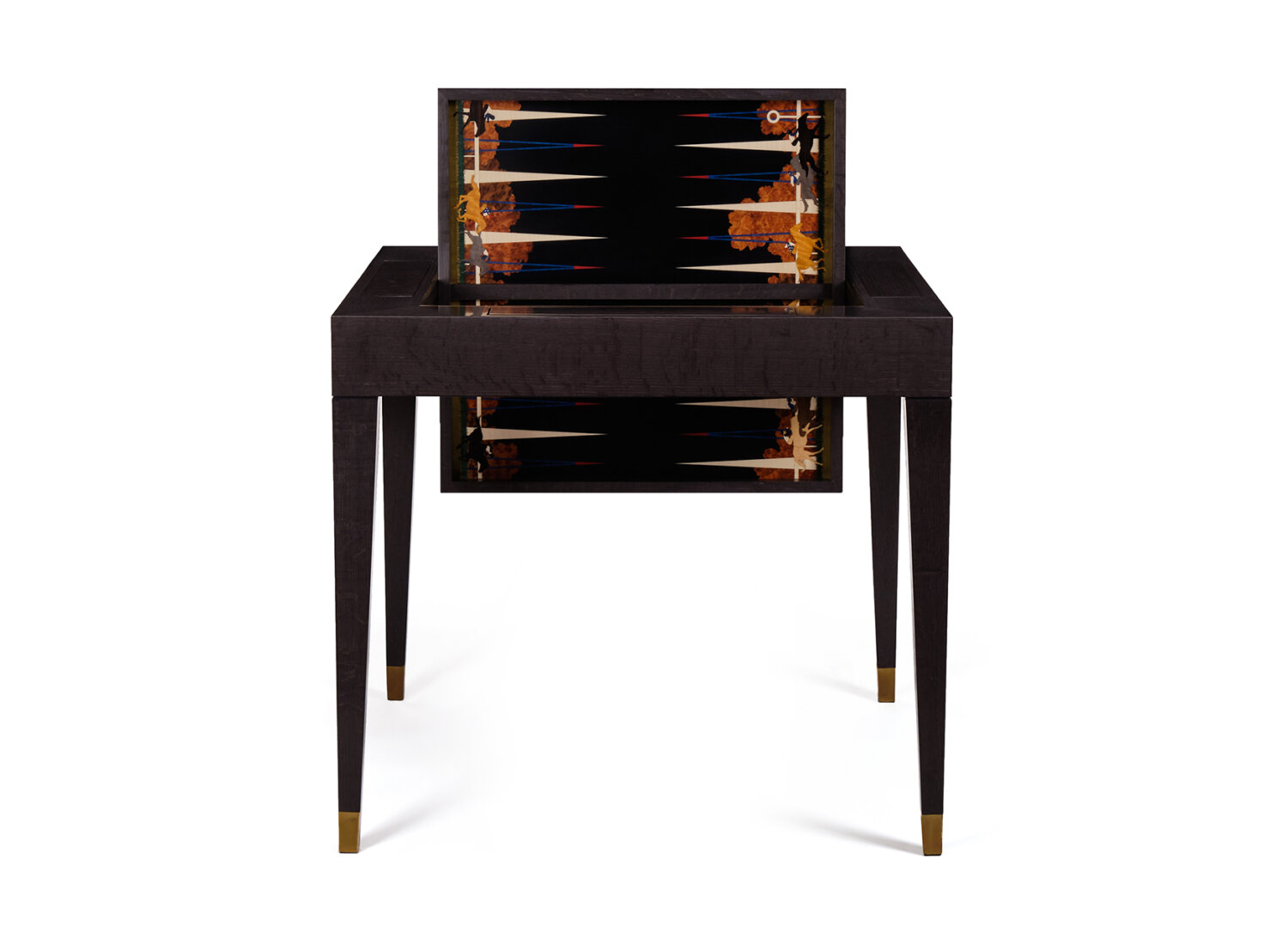 Commissioned by a client who has a deep love of hippos, this bespoke marquetry backgammon board journeys to sub-Saharan Africa. To complement the colours on the board, the owner chose turquoise and pink agate playing pieces, inspired by her memories of African sunsets, each engraved with the location of a hippo sighting.