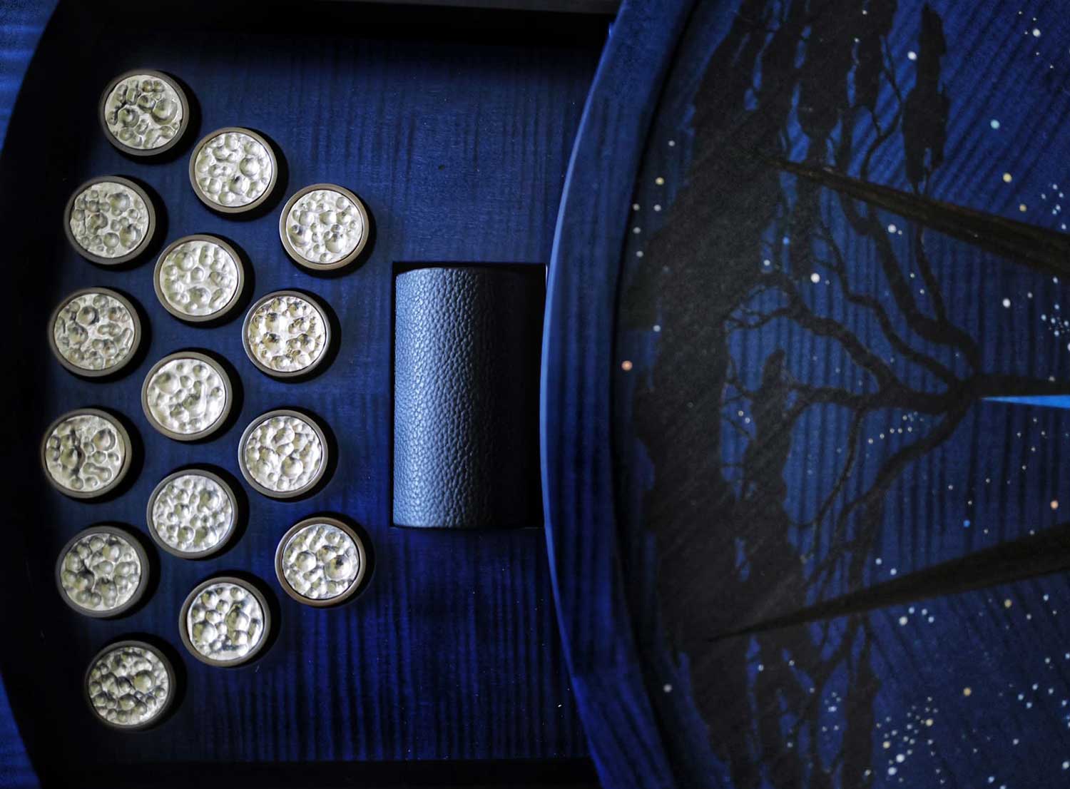 Playing pieces, cast in solid silver, resemble the cratered surface of the moon.