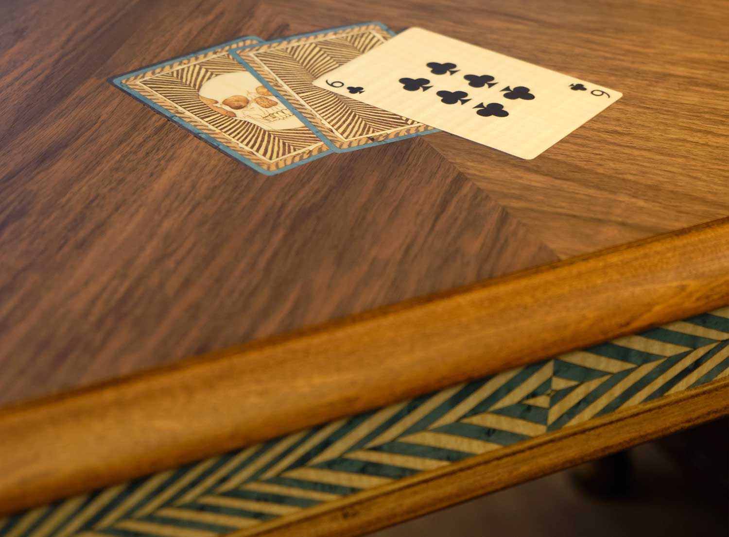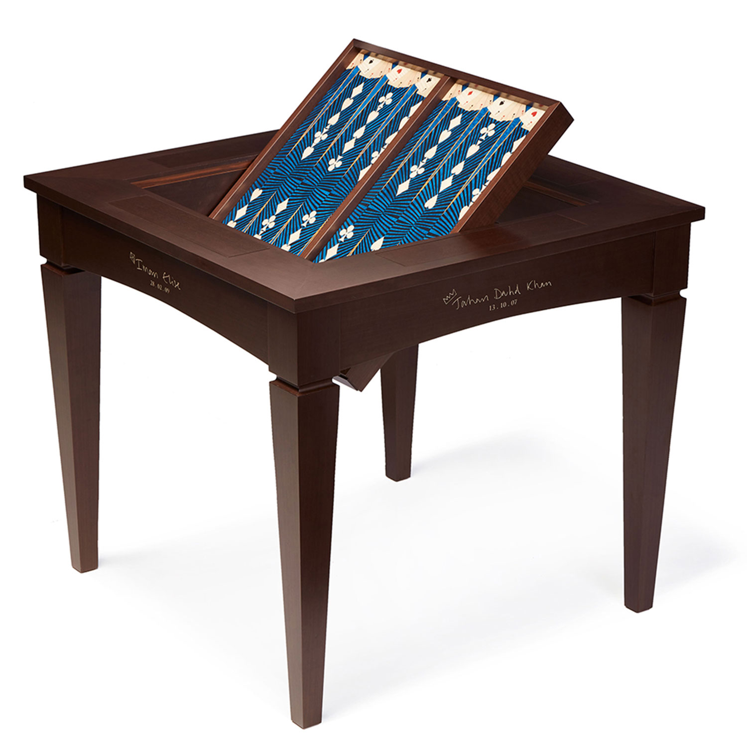 A beautifully crafted piece of furniture, this private commission flips from backgammon to a checkerboard for chess or draughts. Engraved with the names and dates of birth of the client’s children, the marquetry design captures the thrill of a game of cards, with full hands of Aces inlaid into the blue Madrona Burr backgammon board.