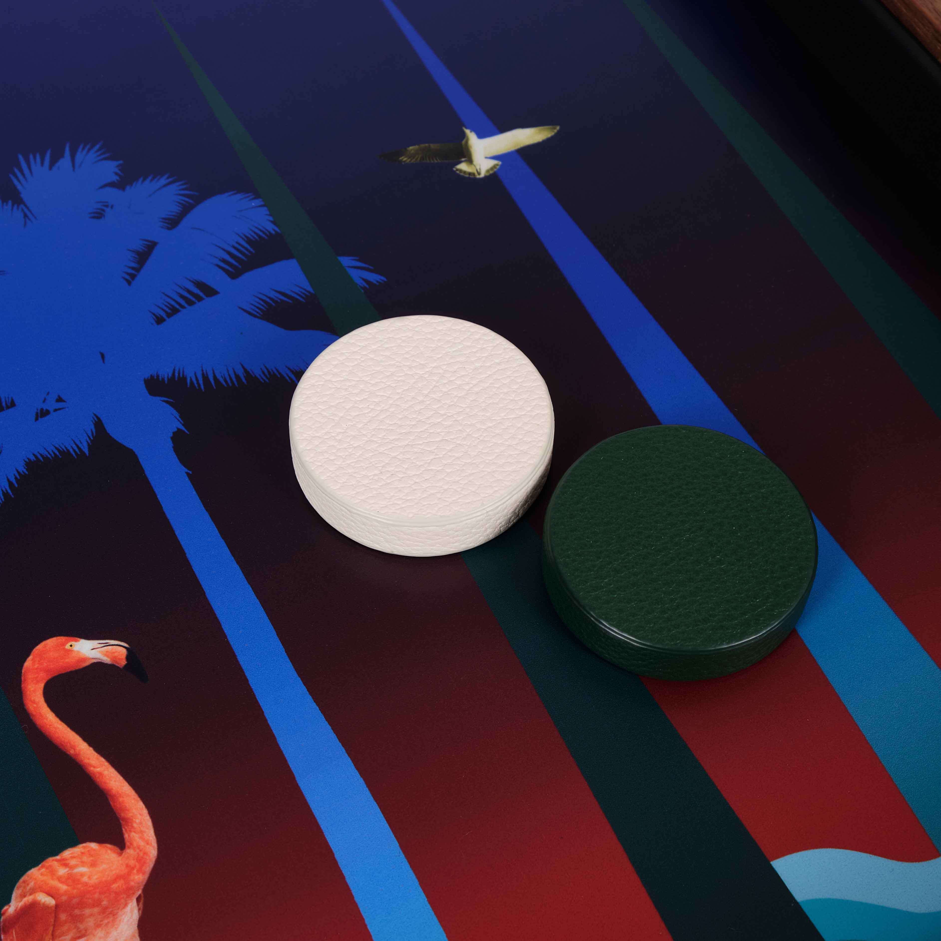 Two people playing a game of Photographic Butterfly backgammon with semi-precious stone playing pieces
