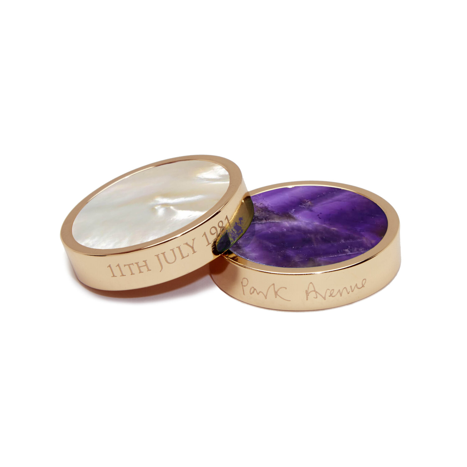 Elevate your backgammon experience with this complete set of 30 semi-precious stone playing pieces. Expertly handcrafted for tournament-size boards, this set features 15 mesmerising Amethyst pieces and 15 luminous mother-of-pearl pieces, personally recommended by Alexandra for their complementary colours, pattern, and texture, and is encased in metal with a gleaming gold finish. A high-performance black leather base ensures smooth movement across the board and protects your playing surface.