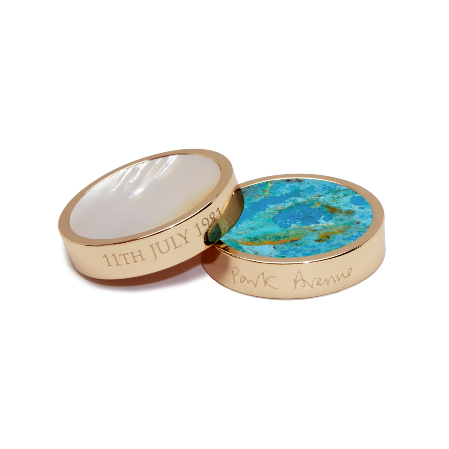 Elevate your backgammon experience with this complete set of 30 semi-precious stone playing pieces. Expertly handcrafted for tournament-size boards, this set features 15 brilliant lapis lazuli pieces and 15 luminous mother-of-pearl pieces, personally recommended by Alexandra for their complementary colours, pattern, and texture, and is encased in metal with a gleaming gold finish. A high-performance black leather base ensures smooth movement across the board and protects your playing surface.