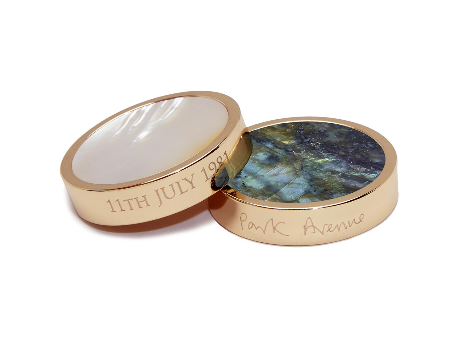 Elevate your backgammon experience with this complete set of 30 semi-precious stone playing pieces. Expertly handcrafted for tournament-size boards, this set features 15 iridescent labradorite pieces and 15 luminous mother-of-pearl pieces, personally recommended by Alexandra for their complementary colours, pattern, and texture, and is encased in metal with a gleaming gold finish. A high-performance black leather base ensures smooth movement across the board and protects your playing surface.
