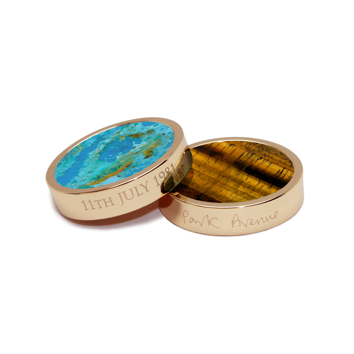 Elevate your backgammon experience with this complete set of 30 semi-precious stone playing pieces. Expertly handcrafted for tournament-size boards, this set features 15 vibrant turquoise and 15 captivating Tiger’s Eye pieces, personally recommended by Alexandra for their complementary colours, pattern, and texture. A high-performance black leather base ensures smooth movement across the board and protects your playing surface.