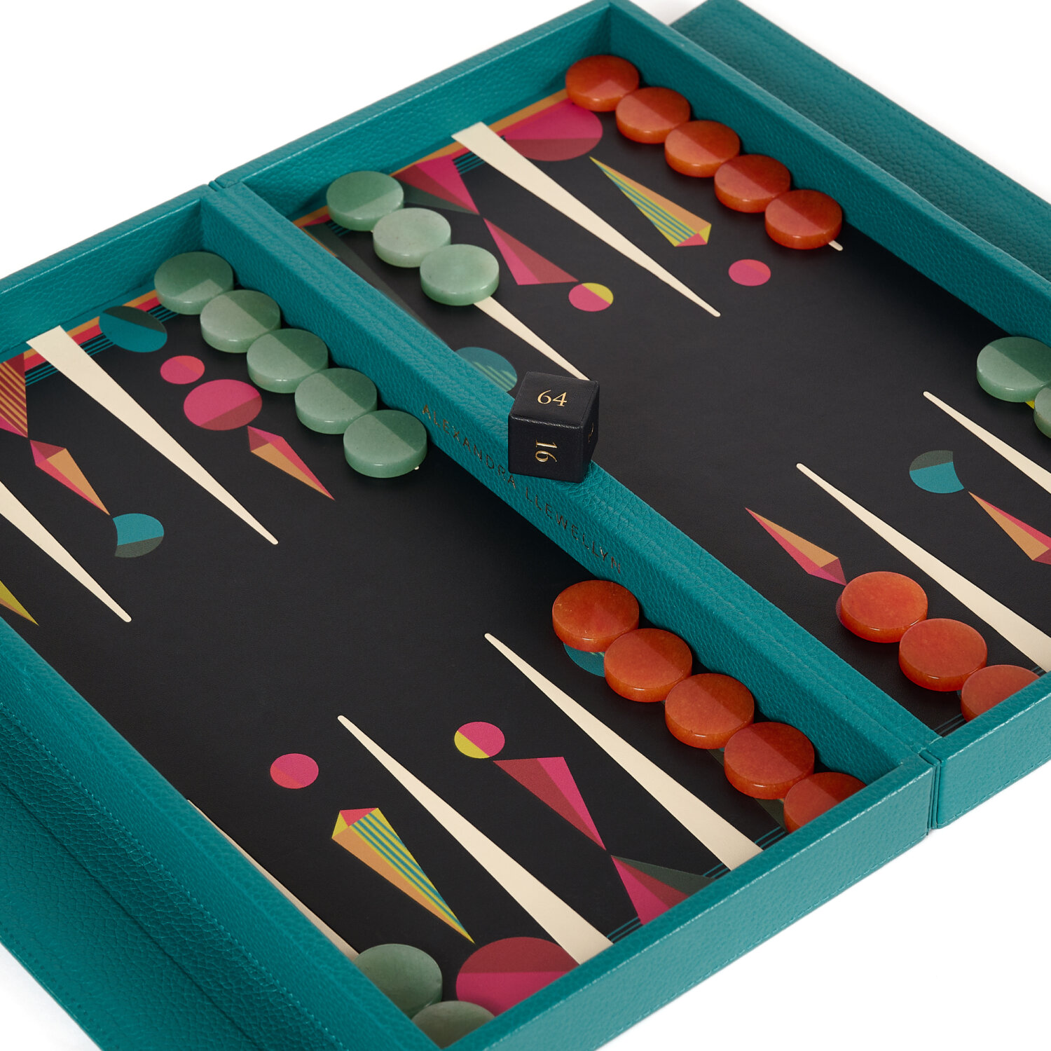 Presented with luxurious semi-precious playing pieces in gentle, grounding orange and green agate, the Parade Travel backgammon set opens to reveal a leather box containing the playing pieces, dice and doubling die, and is perfectly sized to fit in your suitcase.