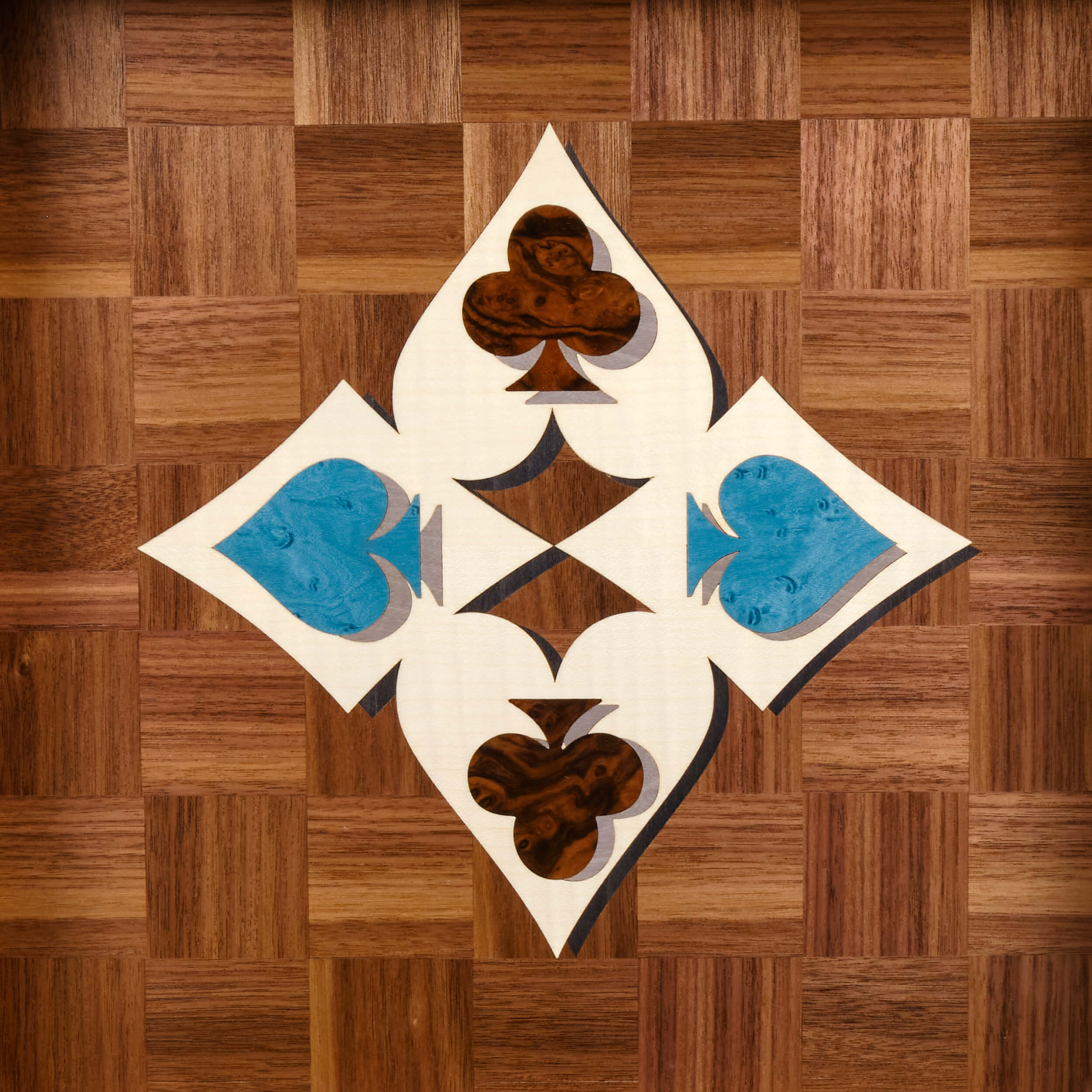 Our extraordinary marquetry artist has used the natural characteristics of the different woods to tell a powerful design story that is rooted in geometry, one of the earliest fields of mathematics, bringing a wonderful warmth and texture to this bold composition of shapes and symbols.