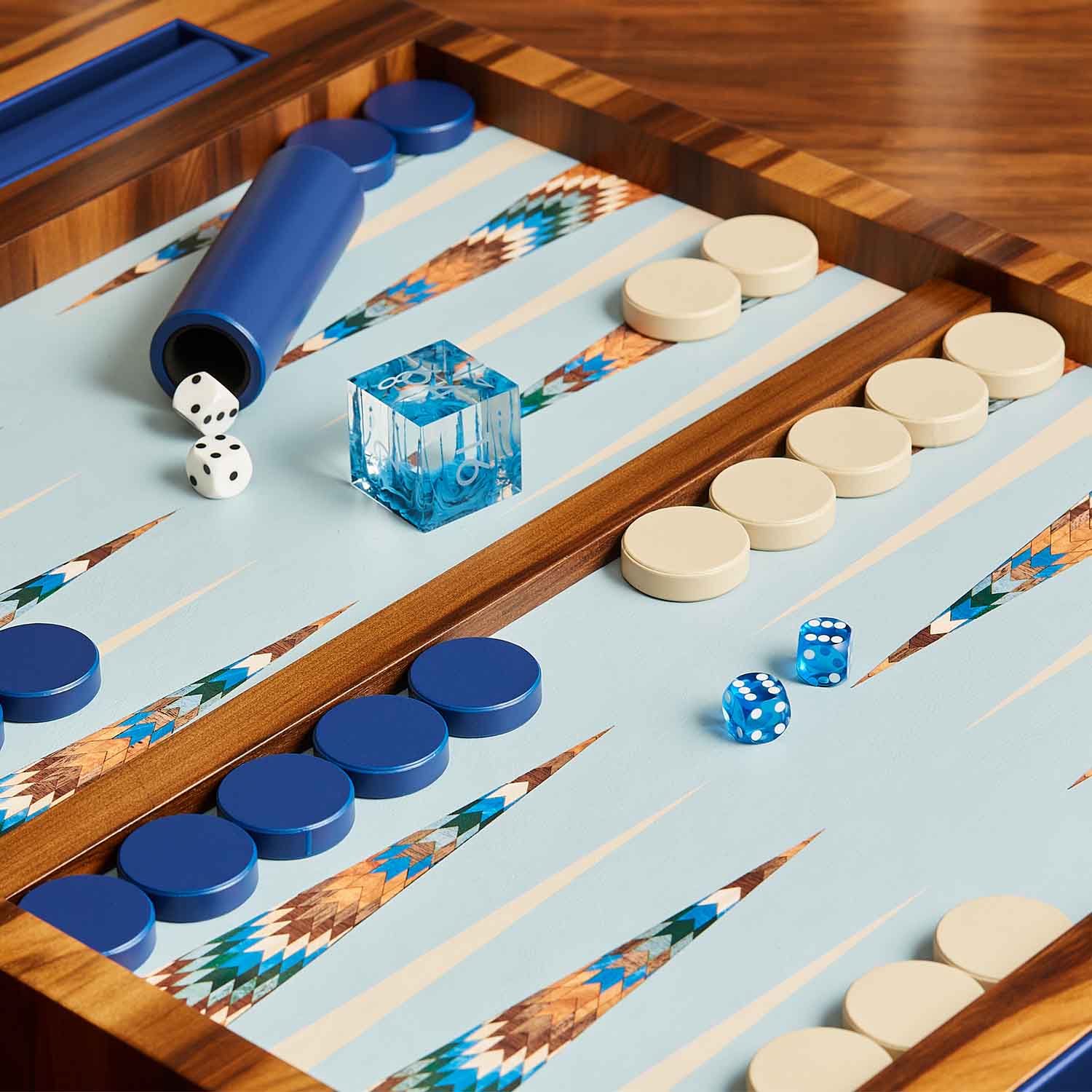 Inspired by Alexandra’s travels through Latin America, the Sky Blue Aztec Table Top backgammon set brings the region’s geometric motifs to life. Echoing patterns found in textiles, tiles and ancient architecture from Mexico to Chile, the design recreates Alexandra’s original marquetry Aztec board, capturing even the finest wood grain details, now beautifully printed on leather.