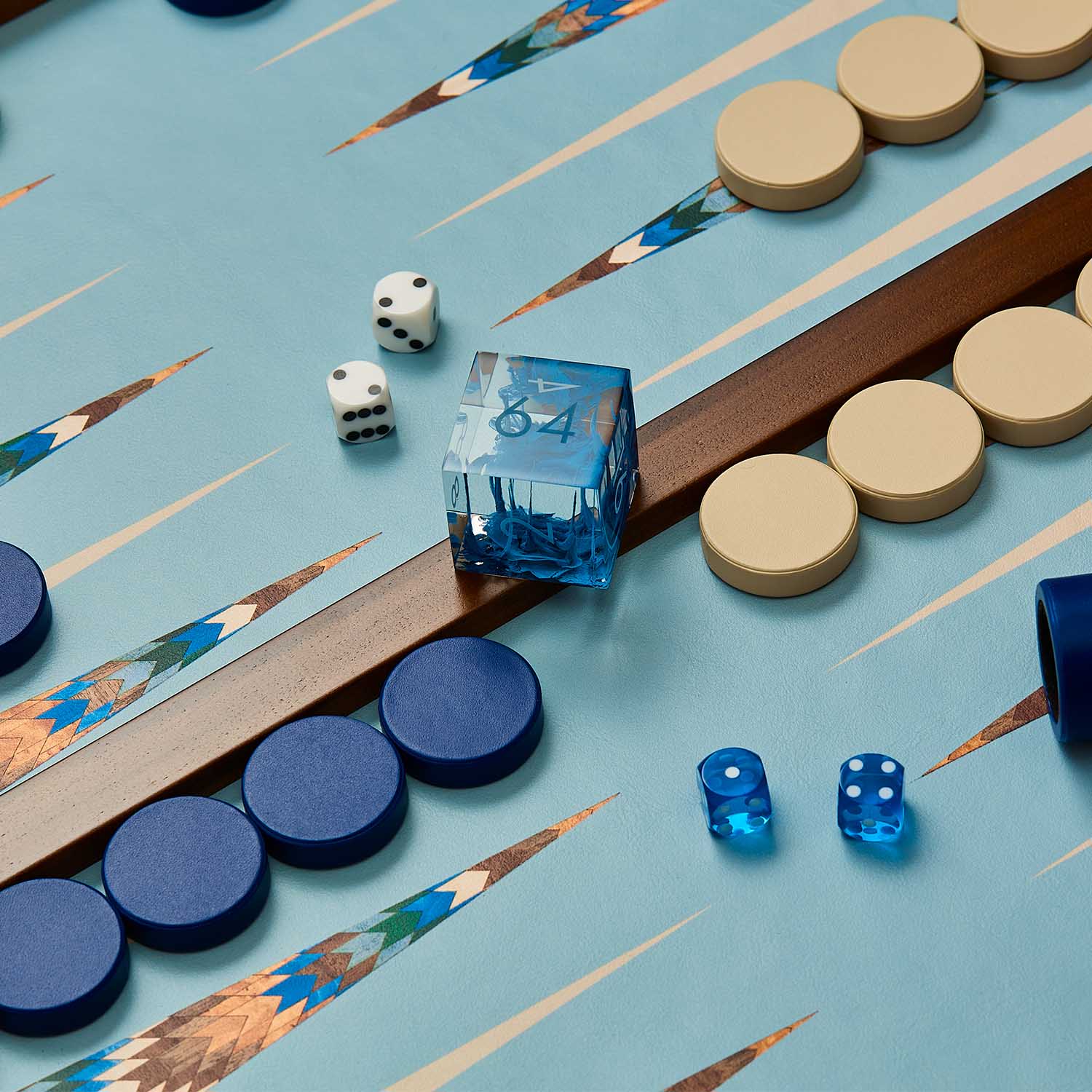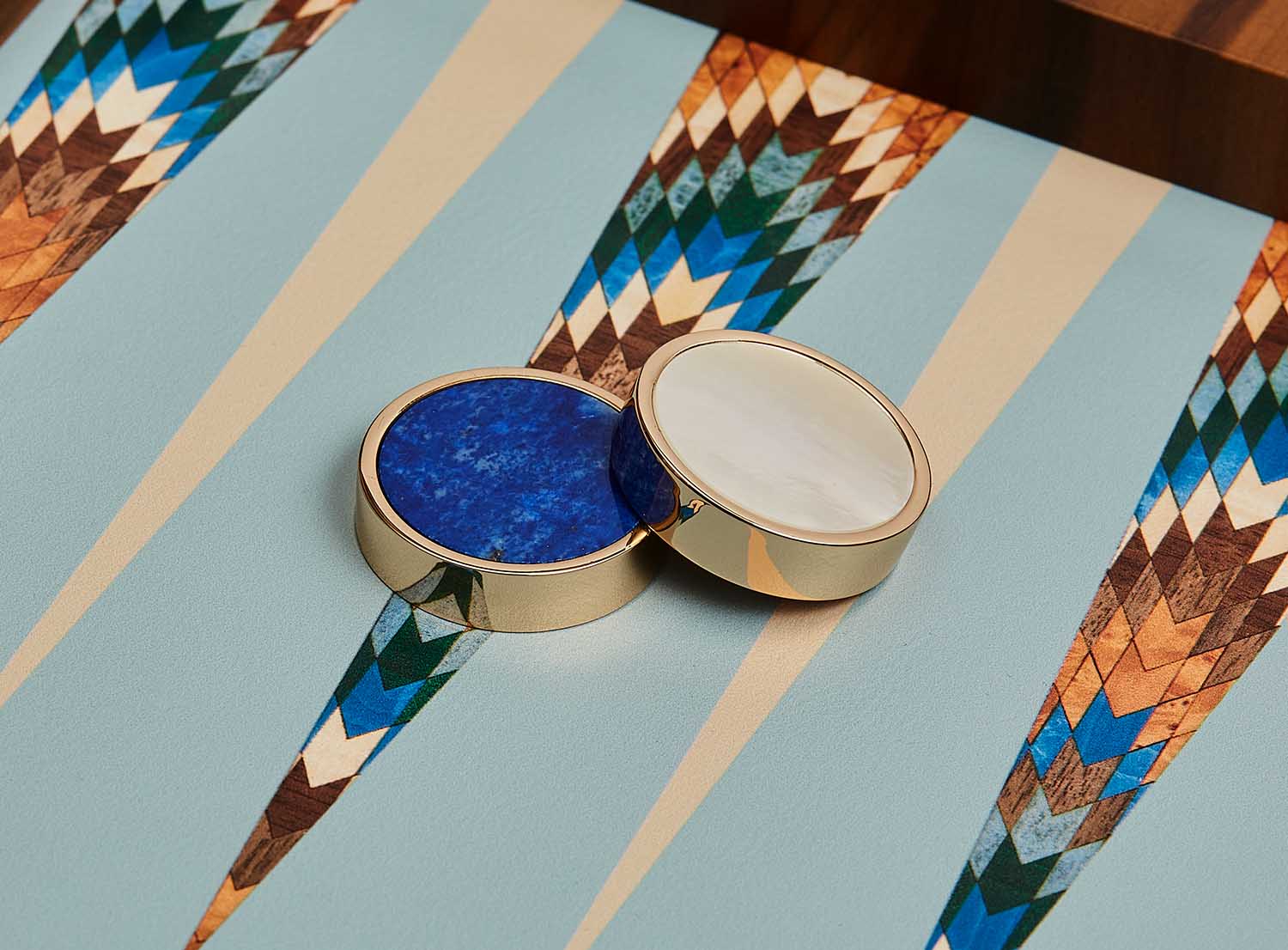 Semi-precious playing pieces are a luxurious addition to our Table Top backgammon sets. Alexandra recommends enhancing your game with lapis lazuli and mother of pearl playing pieces, chosen because they complement the Sky Blue Aztec backgammon board.