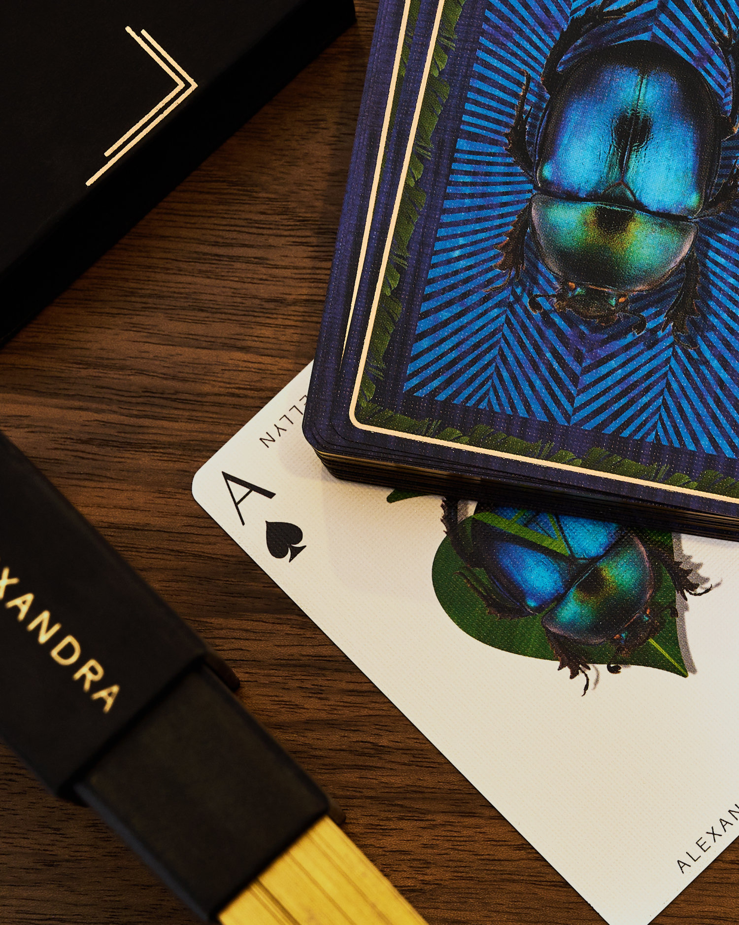 The scarab beetle was the perfect choice to adorn our new playing cards. Gifted with the most stunning metallic colours, this ancient symbol of good fortune is sure to bring you luck in your next game.