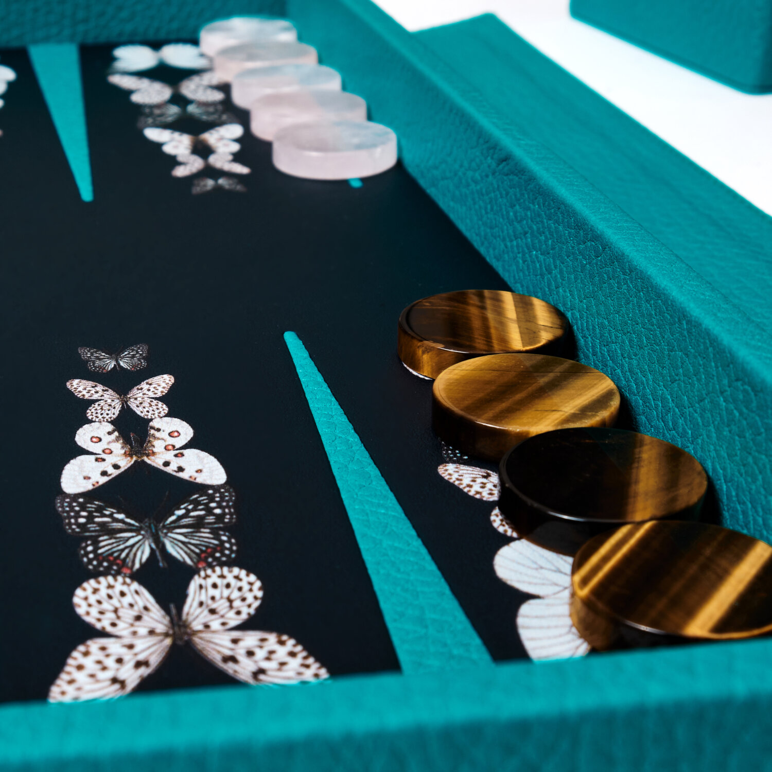 An enduring influence on the world of fashion design and a continuous source of inspiration for Alexandra, Redspot Sawtooth, Black-Veined White and Apollo butterflies are depicted in elegant rows, replacing some of the traditional triangles on the leather backgammon board.