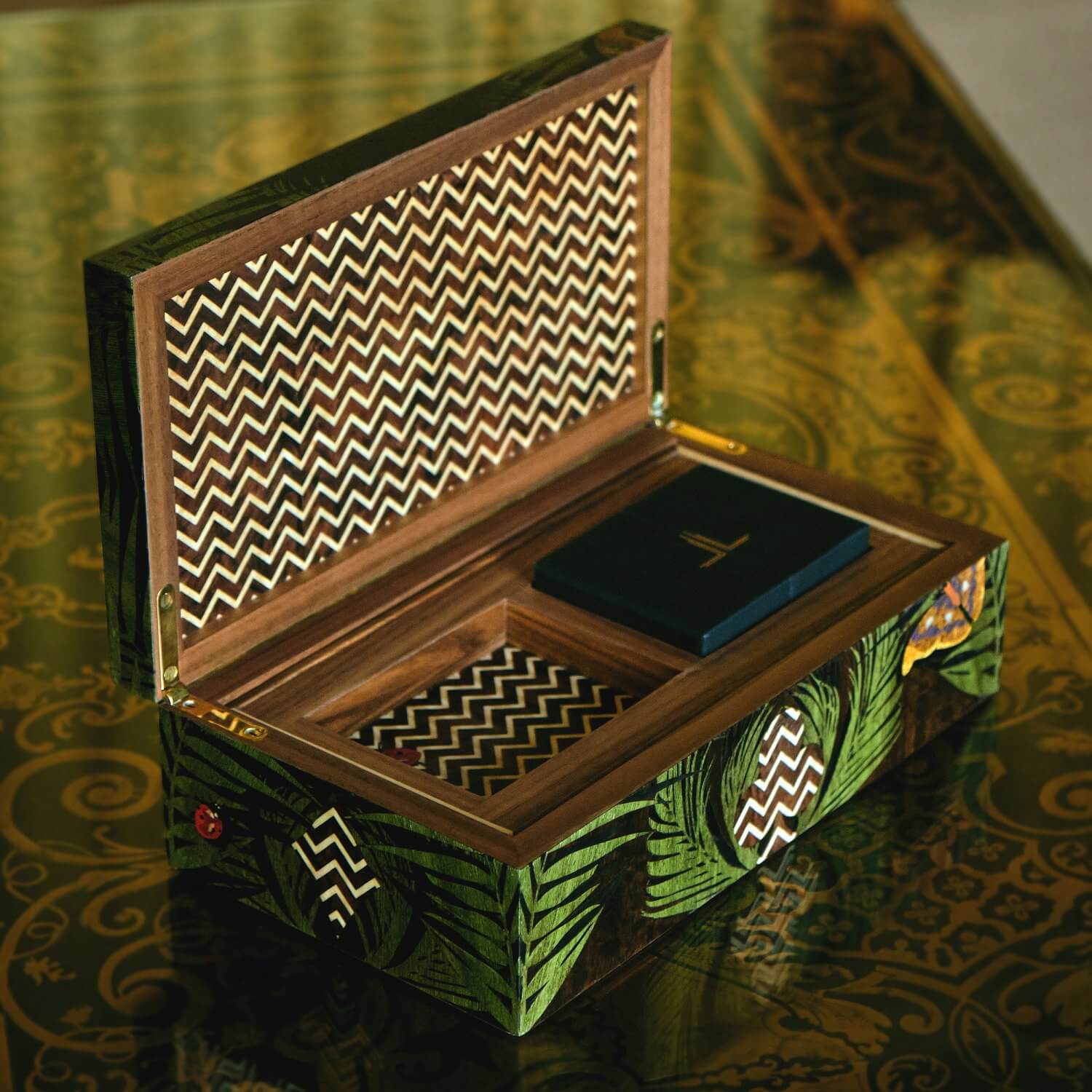 Perfectly capturing the hot and humid jungle atmosphere, the abundant green palm fronds are realised in richly grained Green Koto wood, while the interior of the box is handcrafted from swirling walnut burr. Decorating the four sides of the box, the suits of cards are inlaid with an intricate sycamore chevron pattern, which extends to the inside of the lid.