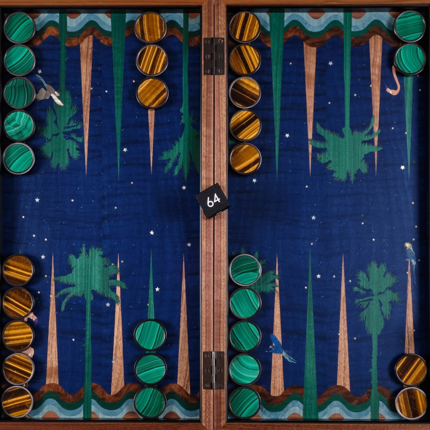 Playing on our Midnight Marquetry backgammon board is always an occasion, with the bright blue feathers of a parrot and the tropical pink of a flamingo beautifully translated in different sustainable woods. Illuminating the scene, each of the mother-of-pearl stars has been individually inlaid by hand by a marquetry artist.