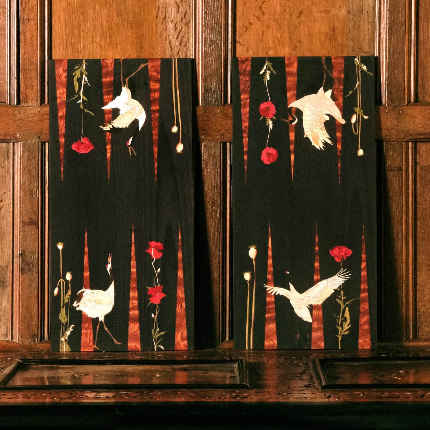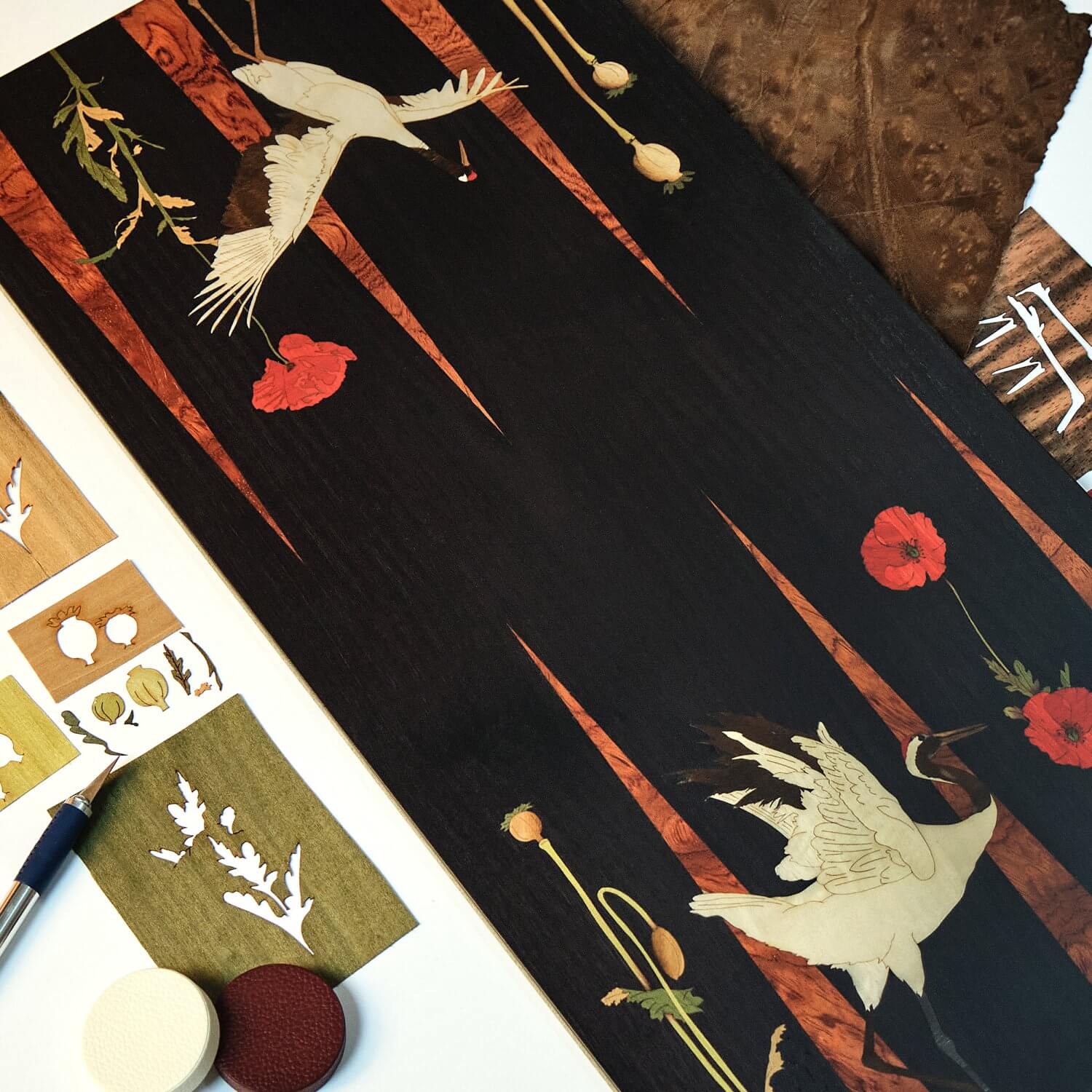 Alexandra looks for the different patterns, textures and grains in the woods that best describe her artwork, including English Holly for the white poppy seed heads and dyed Tulipwood to mimic the vibrancy of the petals. The level of detail is incredible, with the red markings on the crane’s head, the ruffled folds of the petals and the delicacy of the poppy seed stems all captured with extraordinary delicacy upon the board.