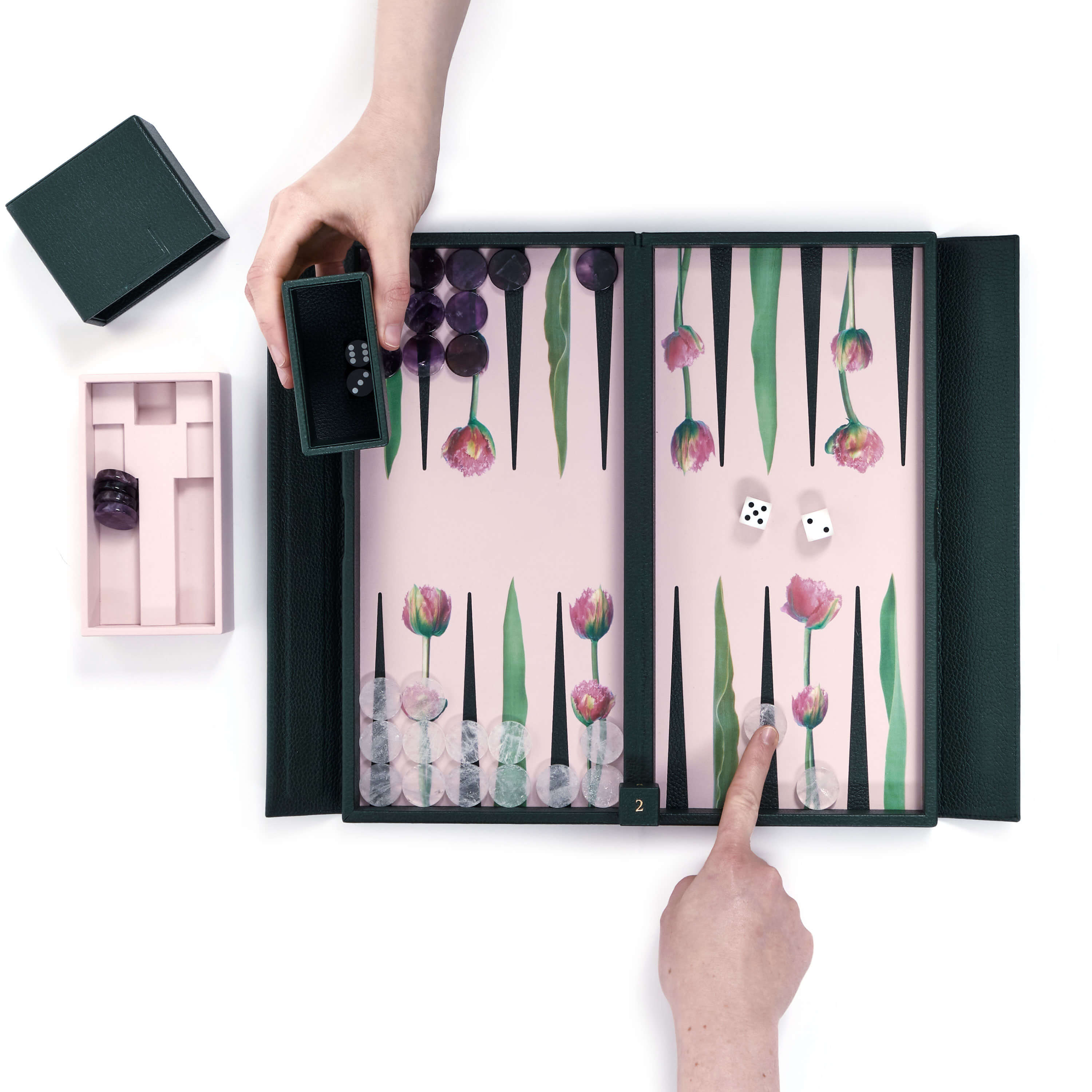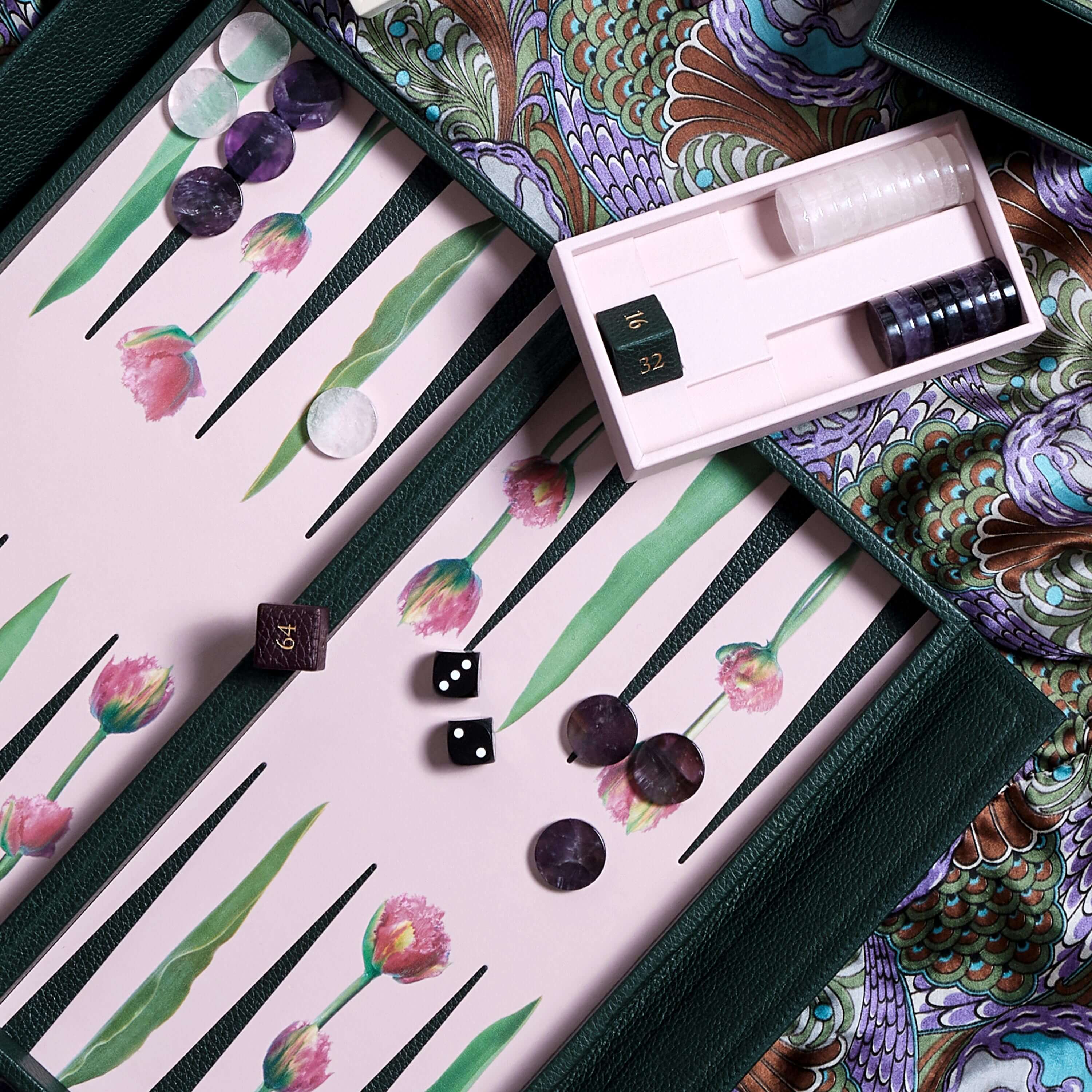 Juxtaposing the soft, silky petals of ruffled pink tulips with lush green leaves, my travel backgammon set celebrates the classic beauty of an English country garden.
