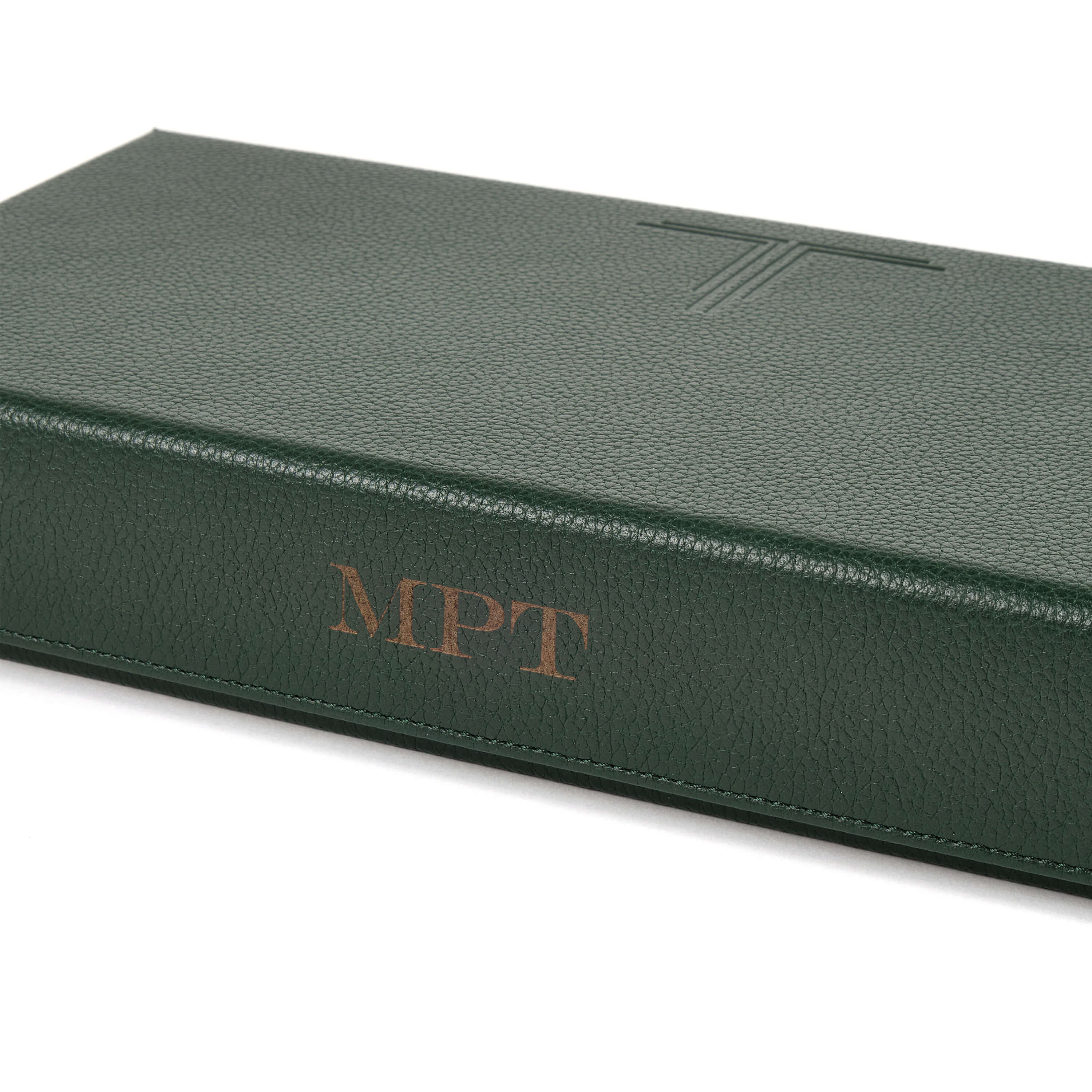• Wrapped in forest green calf leather and inlaid with leather triangles